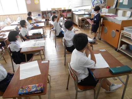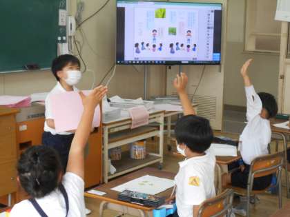 「みんなにはなそう」という学習で、自分が見つけたものをクイズにして、答えてもらうことをしました。質問も「どこで見つけましたか」「何色ですか」などしてみんなで答えを考えて発表しました。いろいろな種類の答えがあり、楽しくできました。