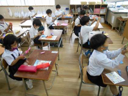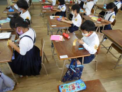 色紙を折って、はさみで切っていろいろな形を作りました。三角や丸など、自分で思った切り方をしたので、それぞれおもしろい作品が仕上がりました。友だちのできた作品を見ておどろいている人もいました。