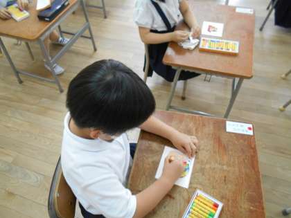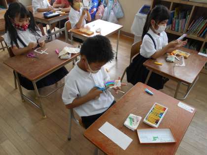 かたつむりにカラフルな色を塗って切り取りました。これは前の図工の時間に描いたあじさいの絵につけるかたつむりです。自分の絵にのりをつけたかたつむりを貼り付けて完成しました。