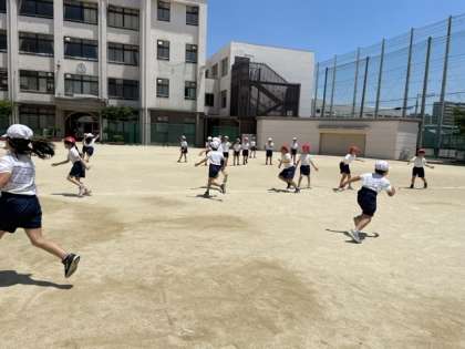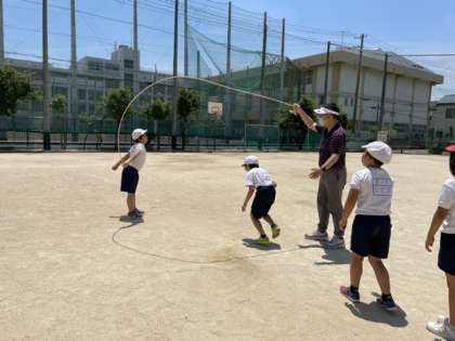 今回の体育は校庭で大なわとびと鬼ごっこをしました。