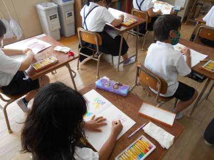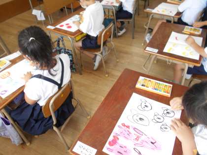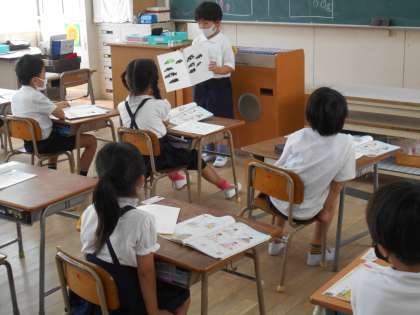 たし算絵本を作って、発表しました。あわせると、ふえると、のどちらかを選んで食べ物や花なども絵を描いて作りました。みんなの前に出て、大きな声で発表することができました。