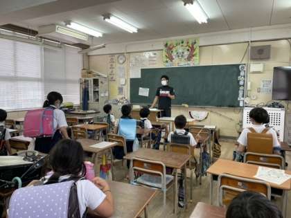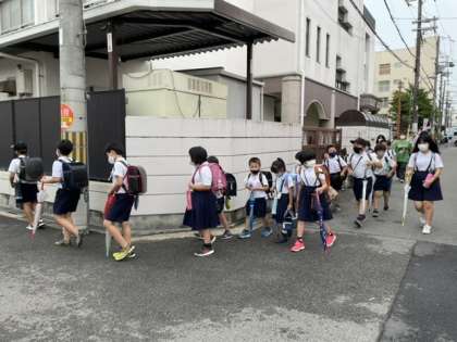 「近畿地方に台風が接近し、大阪市に暴風警報が発令されたので、地域の班で集まり安全に集団下校する」という想定の訓練です。