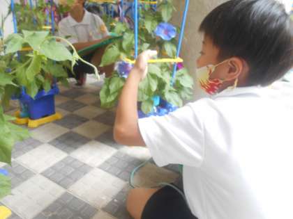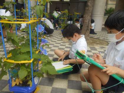 あさがおの花が咲いてきました。むらさきやみずいろなどあって、子どもたちも喜んでいました。つぼみや花、咲き終わった花などを観察カードにかきました。花を触ると「つるつるしている」と言っていました。