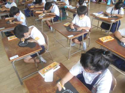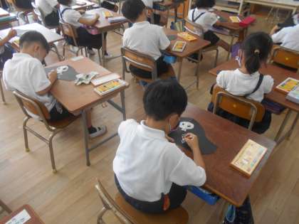 2組もお店の準備をしています。今日は店番の時にかぶる帽子を作りました。いろいろなデザインを描いて、自分だけの帽子を作りました。ポスターも作りましたので、準備が進んでいます。