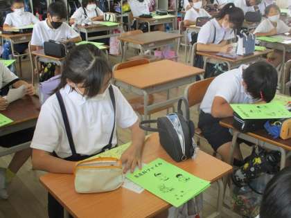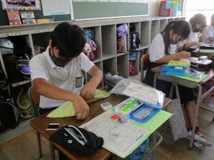 裁縫の学習を楽しみにしている子が多いみたいです。家でもたくさん練習しているみたいですね。ご協力ありがとうございます。今回は「名前ぬい」と「ボタン付け」がめあてでした。プリントと動画で手順を確認し、作業に取り掛かりました。頭でわかっているけど、うまくいかないという子がまだまだいていますが、最初の頃に比べると、糸通し・玉結び・玉止めはレベルアップしています!!いい感じですね。