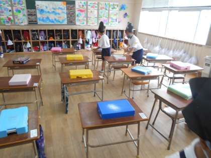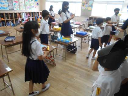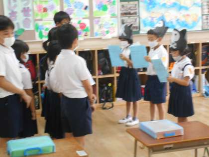 たからさがしのお店番をしました。入り口で説明する係、宝の見つけ方を説明する係、見つけた宝を隠す係に分かれて仕事をしました。来てくれたお客さんも楽しそうに遊んでいました。