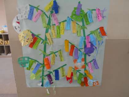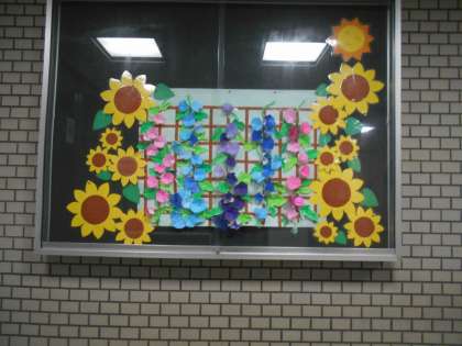 7月の玄関掲示は1年生が作ったあさがおが掲示しています。教室前の廊下には七夕で願い事を書いた短冊も掲示しています。来週の懇談会に来られた時に見てください。