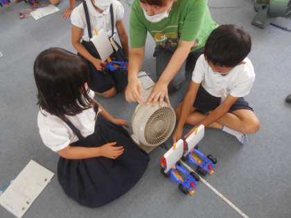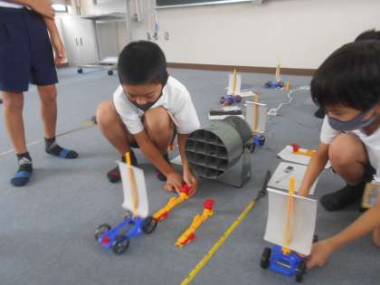 今回は風の強さによって、距離が変わるのか実験をしました。送風機の風を操作し、距離を測りました。次回はそれを基に実験結果をまとめていきます。