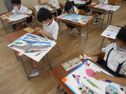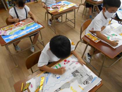 図工の時間に絵を完成させました。のりで貼り付けた新聞紙にいろいろなものをクレパスで書き足して、作品を仕上げました。教室に掲示していますので、懇談会が終わりましたら、見てください。
