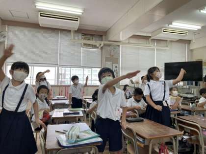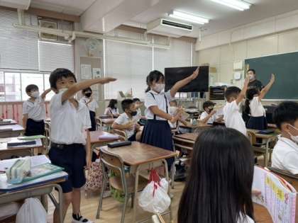 先生が出された漢字の「空書き」をしている子を、隣の席の子がチェックします。