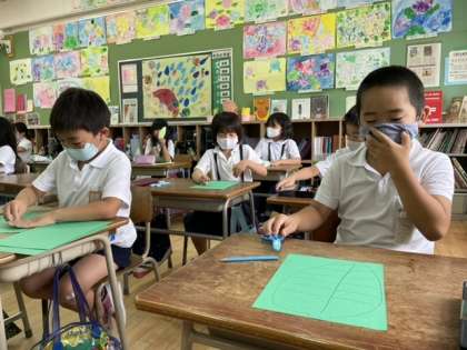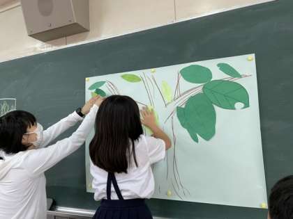 2年2組では、毎月後ろの黒板を子どもたちの合同作品で飾ります。