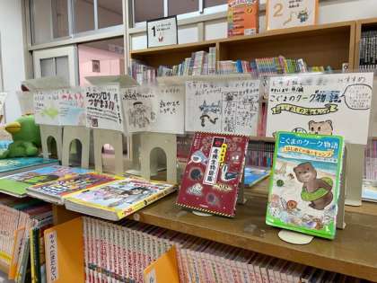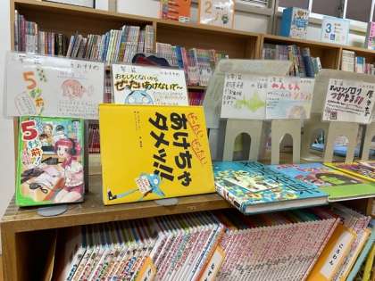中泉尾小学校では、昨年度の図書委員会から本の紹介のポップを掲示しています。