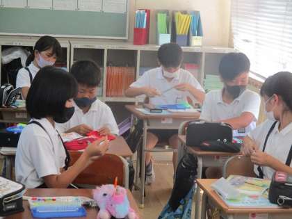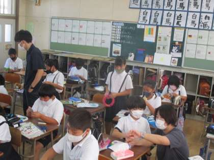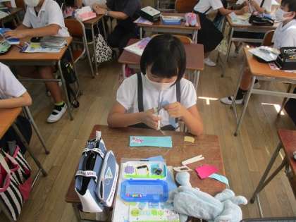 家庭科の小物作りが終わった人から、林間のカバンにつけれるイニシャルの小物を作りました。小物作りを経験した後なので、スムーズに作れていました。林間につけていくためにと、短い時間の中でがんばっていました。作ったものは、ぜひリュックにつけてきてほしいです。5年生全員でおそろいの小物つけて、楽しみましょう!!