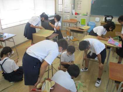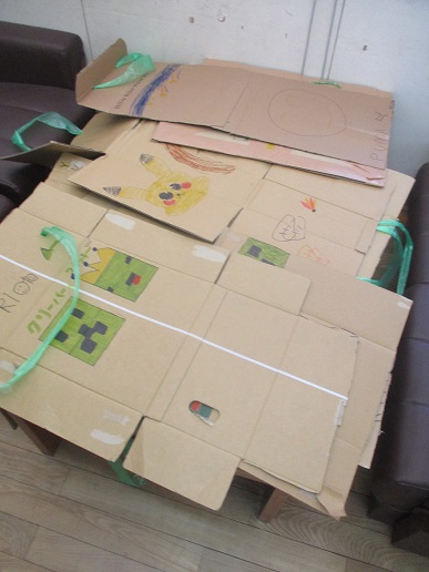 林間学習で使う、ダンボール作りをしました。ダンボールを開いて、持ち手を付け、自分のだとわかるようにマジックで絵やマークや模様をつけました。作ったダンボールが壊れてしまうぐらい、みんなで一緒にすべりましょう!!