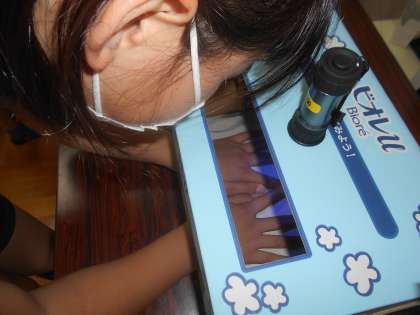 ライトで照らしてみると、汚れがたくさんみられ、子どもたちもびっくりしていました。