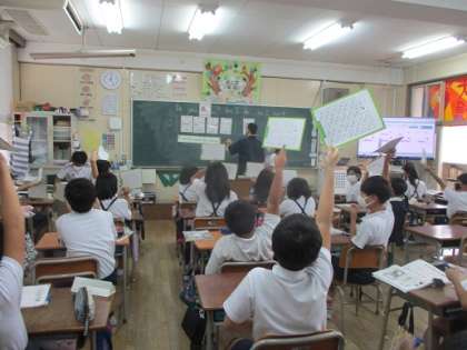 unit4を進めています。always usually sometimes neverこの4つが徐々に分かってきた様子でした。また。先生と共に、単語だけを話すだけではなく、フレーズにして答える練習もしています。1学期と比べ、英語を話す事も書くことにも慣れてきた様子なので、2学期はさらにパワーアップしてきましょう。