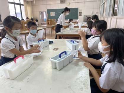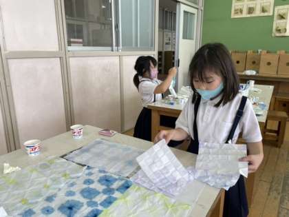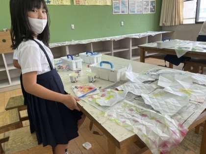 2年2組が、図工の時間に折りぞめに挑戦しました。