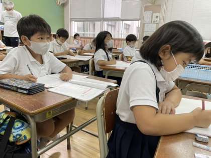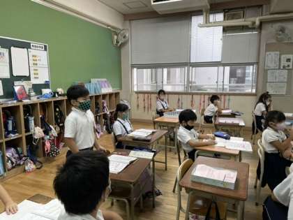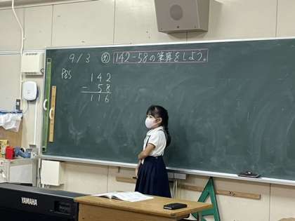 問題を解いてから友だちにやり方を説明し、前に出てきて発表をしています。