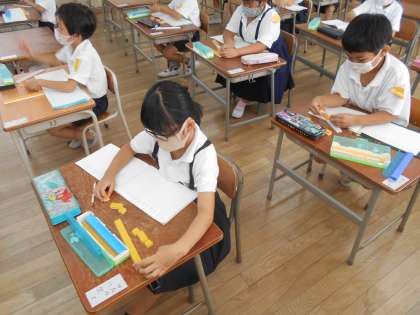 20の数までのたし算引き算をしています。ブロックを動かして自分で答えを確かめながら学習したりしています。慣れてきたのでブロックの操作も後片付けも早くなりました。
