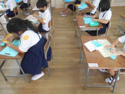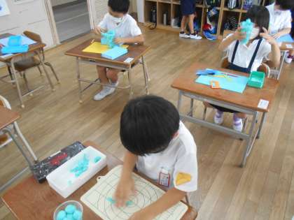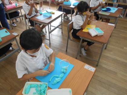 ねん土でパフェを作りました。どのようなものを作ってケースに入れるかを話し合ってから始めました。ケーキや団子、イチゴにバナナなど自分が食べたいものを作っていました。上のほうには、クリームや果物などを作ってのせて完成しました。