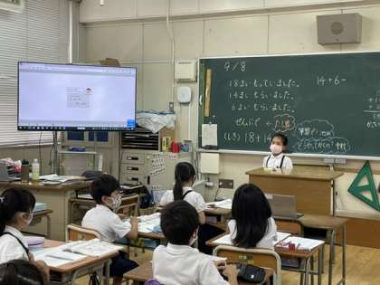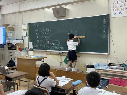 今までは2つの数の計算だったので、3つの数の場合は、どのように計算するのかを自分で考え、前に出て黒板を使いながら発表しました。