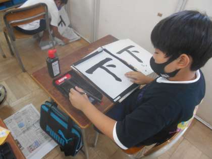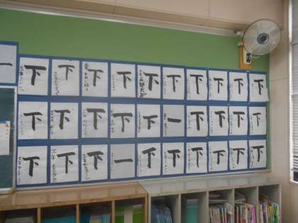 今回は「下」を書きました。「とめ」と「点」に気を付けて書くことをめあてに取組みました。三画目が難しかったようで、納得がいかず、何回も書き直していました。完成した作品はみんな上手に書けていました。