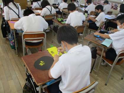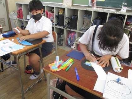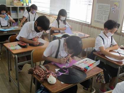 運動会の練習中の暑さを乗りきるために、うちわ作りをしました。自分の名前を入れ、好きなようにデザインしました。それぞれ個性のあるうちわが出来上がりそうです。運動会のどこかで使えたらいいなとも思っています。