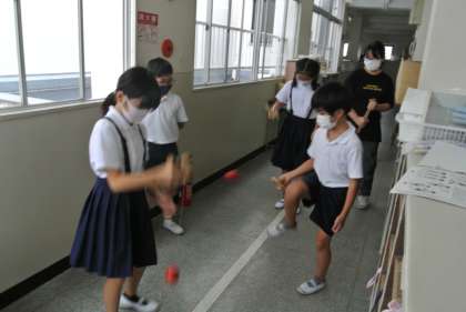 外で遊べないので、けん玉に励む子どもたちを発見!