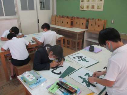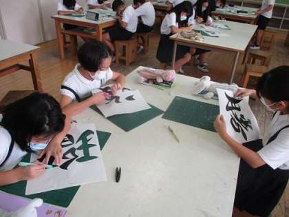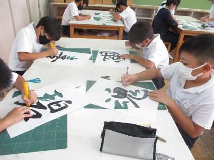 ソーラン節で着るはっぴの背中の文字を切り抜きました。カッターナイフとはさみを使って慎重に取り組んでいました。背中にペイントしたら、いよいよソーラン節も雰囲気が高まってきます。