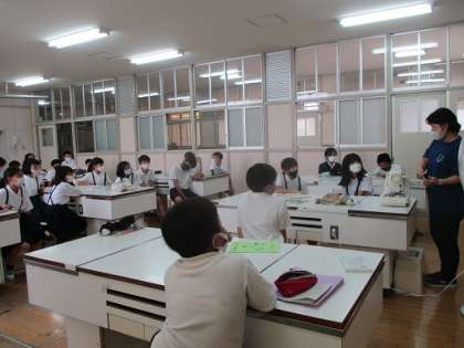 家庭科室に行き、ミシンの使い方の学習をしました。実際に目の前に出して、から縫いをしてみました。初めて触る子も多く、楽しみながら行えていたと思います。上糸や下糸などの付け方を覚え、エプロンを作っていくことになります。がんばりましょう!!