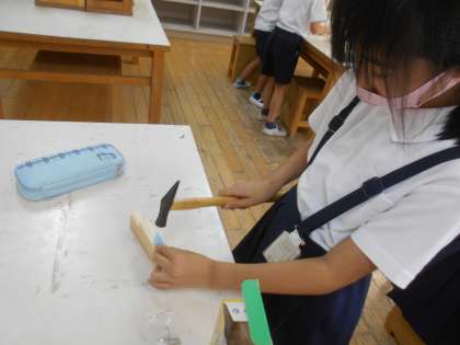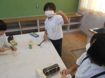 今回の作品は、金づちと釘を使ってつくっていきます。今日は、金づちを使って釘を打つ練習をしました。まっすぐに打つように意識をしていましたが、なかなかうまくいかなかったようです。それでも子どもたちは初めての体験だったのでとても楽しそうでした!