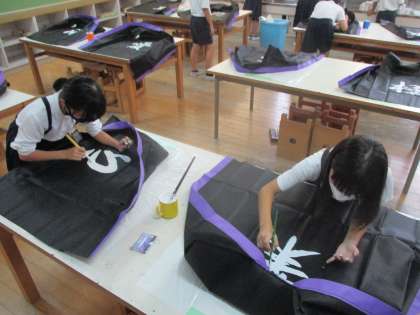 ソーラン節で着るはっぴに文字を書きました。自分の名前の一字にしたり、好きな漢字、運動会への思いなど、いろいろな字があります。失敗しないか心配しながら行いましたが、みんな上手にできました。