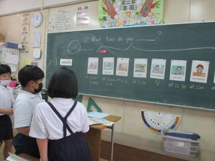 what time do you get up? go to bed?−−−このフレーズにも慣れてきた様子です。様々な活動を通して、フレーズに親しんでいます。ここからは、みんな一人ひとりが、フレーズを使いこなせるように、発表する機会などを増やして、練習していこうとおもいます。
