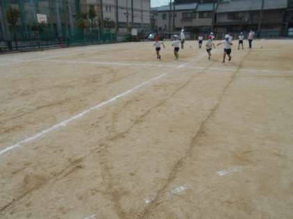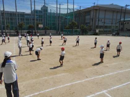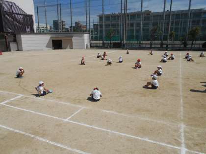 運動場で場所の確認をしました。隊形移動したときにどの場所に行くのか確認して踊りました。その後、かけっこの練習をしました。まっすぐ線と線の間を走ることをしました。残りはリレーの練習を金曜日にします。