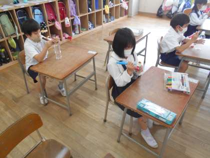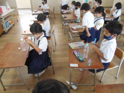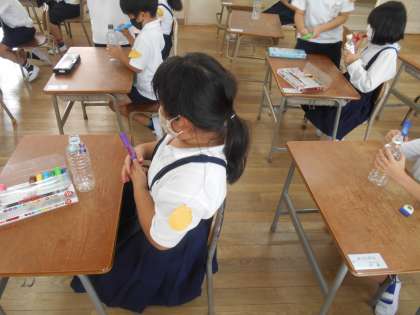 リレーで使うペットボトルの蓋に自分のマークを描きました。たくさんあるペットボトルの中から自分の分を見つけて持って走ります。間違うとやり直しになるのでわかる色で絵や模様を描きました。金曜日にリレーの練習で使う予定です。