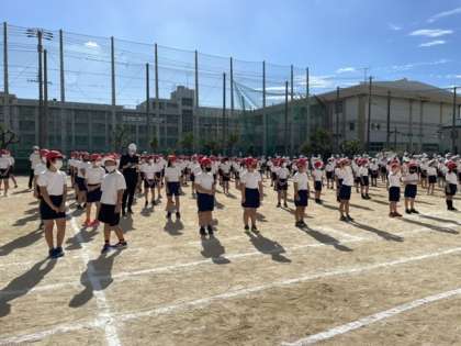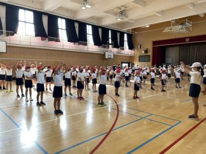 今回は1・3・5年生は運動場、2・4・6年生は体育館で開会式、はじめの体操などの練習をしました。