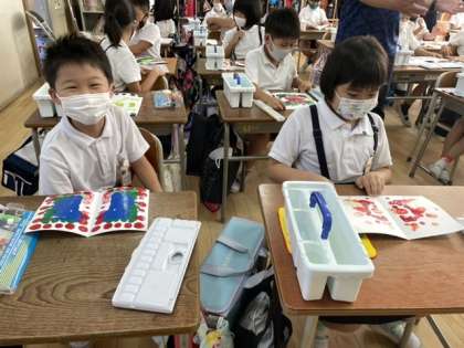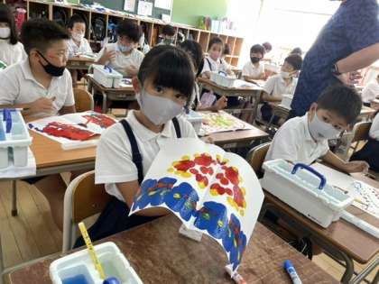 2年1組では、図工で 「デカルコマニー」の学習をしました。