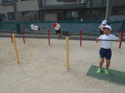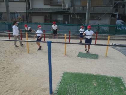 鉄棒をしました。いろいろな技の書いたカードを持って、順番にしました。鉄棒にぶら下がることから始まり、鉄棒の上にのって止まることなどをしました。次からは少しずつ難しい技になっていきます。