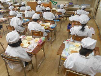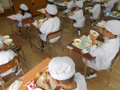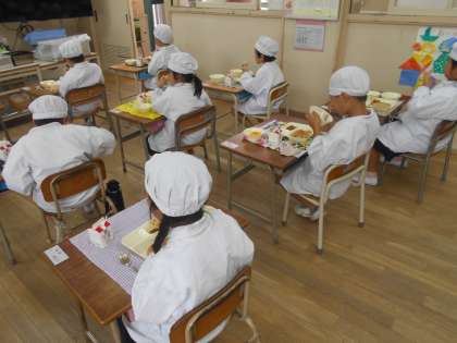 給食の様子です。前を向いて食べています。随分早く食べることができるようになりました。体を成長させるためにもしっかり噛んで食べましょう。