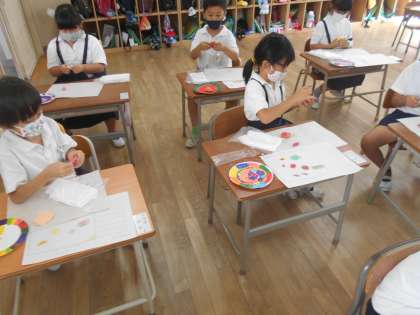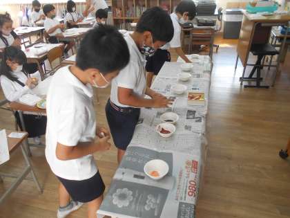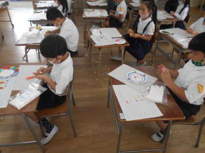 紙粘土に絵具を混ぜて色を付けました。そして、食べたいものを作りました。お寿司やからあげ、果物など楽しみながらいろいろなものを作りました。できた食べ物は、自分が色を付けたお皿に置きました。おいしそうなものがたくさんできました。(1組の様子です)