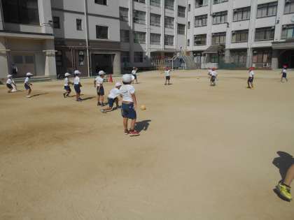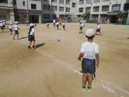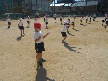 縄跳びを始めました。運動会でもらった短縄で前とびから始めています。一回回して一回跳ぶことを練習しています。その後は、鉄棒とボール投げに分かれて活動しています。今日のボール投げはボールを転がして手で取る活動をしました。