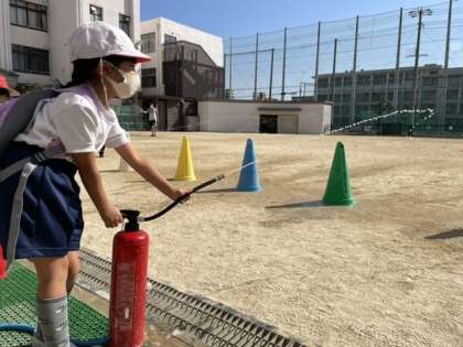 消火器は初めて体験する子も多く水をコーンに当てて訓練しました。