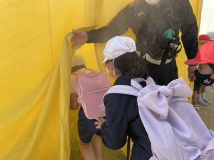 2年1組は悪路歩行訓練・水消火器体験・煙テント体験の順番でまわりました。