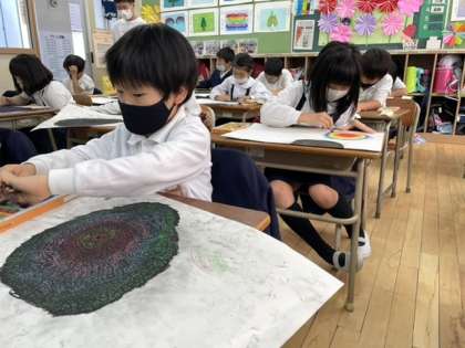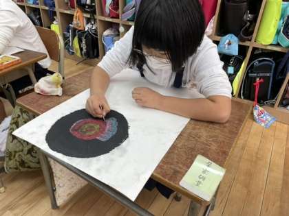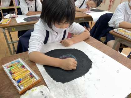 とても細かい作業で子どもたちは夢中になって黒のクレパスを削っていました。