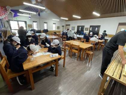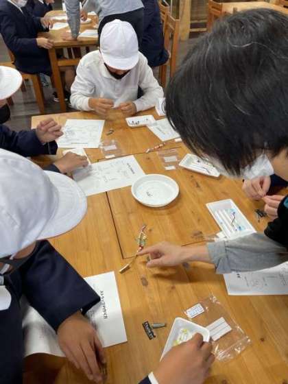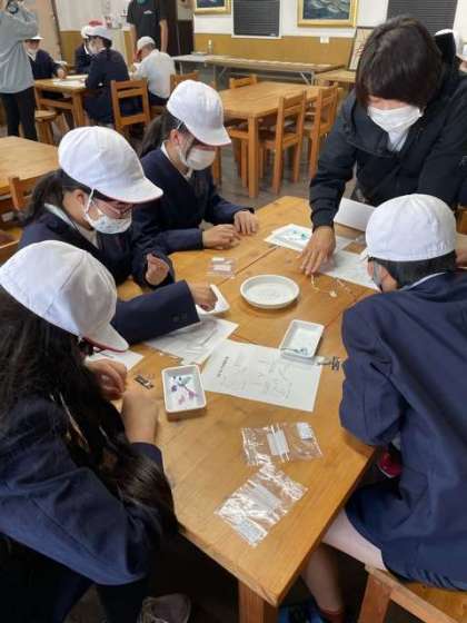 魚釣りを待っているクラスはストラップ作りに挑戦です。ビーズを糸に通して魚の模型をつけて出来上がりのはずですが...