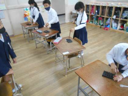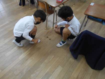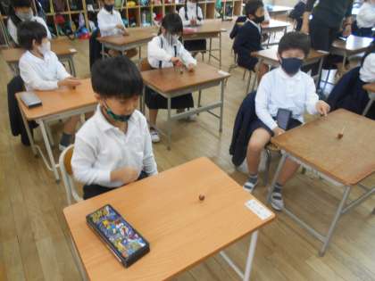 どんぐりのこまを作りました。きりで穴を開けてつまようじを入れてできあがり。完成した後は、だれが長い時間回るか競争しました。その後は友だちと回しあって比べていました。1組の様子です。