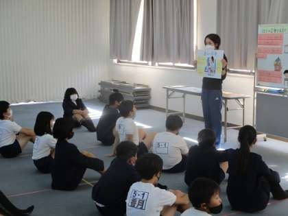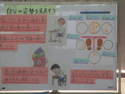 体重測定前に正しい姿勢のチェックを行いました。その場で50歩歩いて、どれだけずれているかをチェックしました。その場にいれた子はたったの5人です。普段から姿勢正しく過ごす大切さを教えてもらいました。