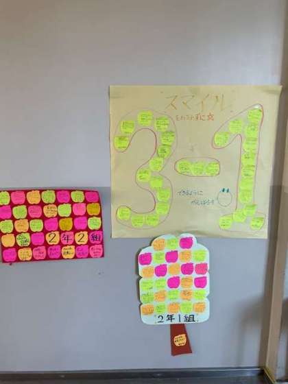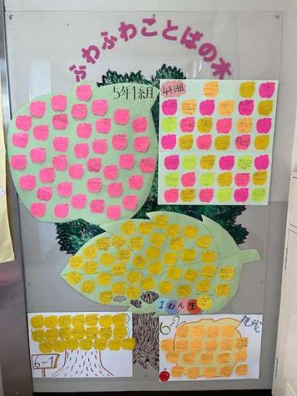 10月のふわふわ言葉は「いろいろなことに挑戦しよう」でした。この学年も後半に入り、一人ひとりに今一度どんなことを頑張りたいか全校のみんなに考えてもらいました。一生懸命考えた結果が壁一面に貼ってあります。今日の参観でぜひ、ご覧いただきますようお願いします。
