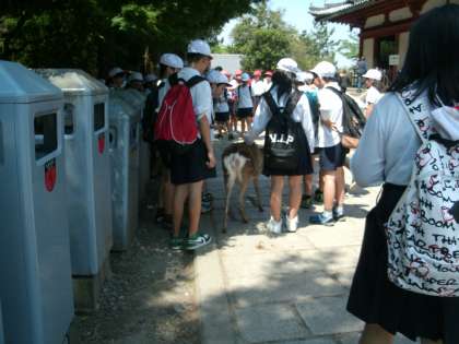 5月8日に5・6年生の遠足で奈良公園に行きました。すぐ近くにいる鹿に驚きながらも、楽しそうに長い道のりを歩いていました。東大寺の大仏を見学し、大仏の鼻と同じ大きさの穴を通りぬけたり、芝生の上でみんなでお弁当を食べたり、すごく楽しい遠足になりました。