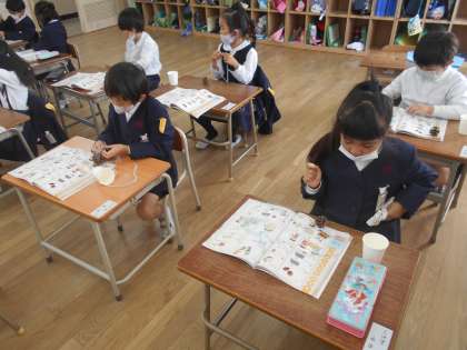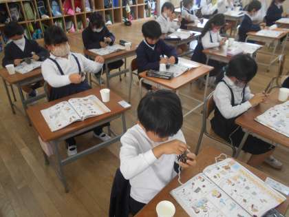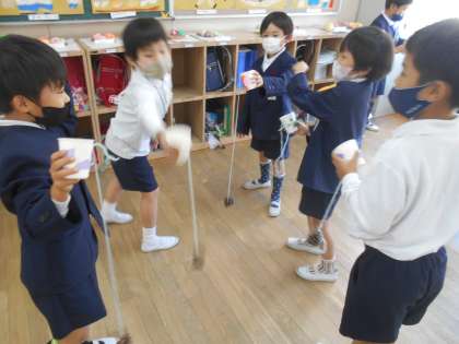 まつぼっくりを使ってけん玉を作りました。まつぼっくりと紙コップに毛糸を結びつけて作りました。紐の長さを調整するのが難しかったですが、出来上がってみんなで一緒にやってみました。失敗しないで何度も続けて入れる子もいました。(1組の様子です。)